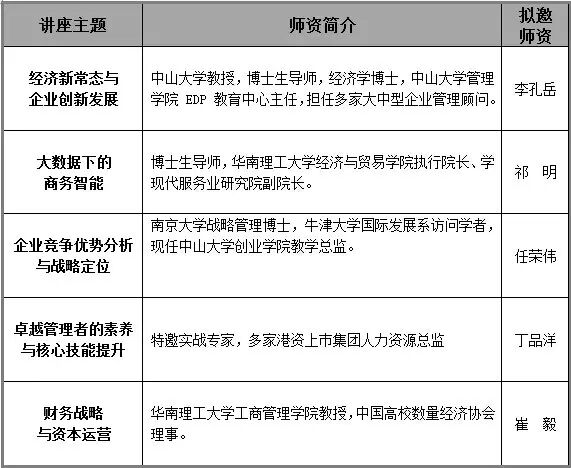 据悉,本届EMBA精英总裁研修班为期一年,由李孔岳、祁明、任荣伟、丁品洋等国内外著名专家领衔,为商界精英人士精心设计了最精品课程。课程整体囊括从宏观大势把握到企业管理落地、培养企业家各方面管理能力、从管理思维到财务实务,可从不同的视角聚焦企业家的视野与领域和提升企业家的素养。