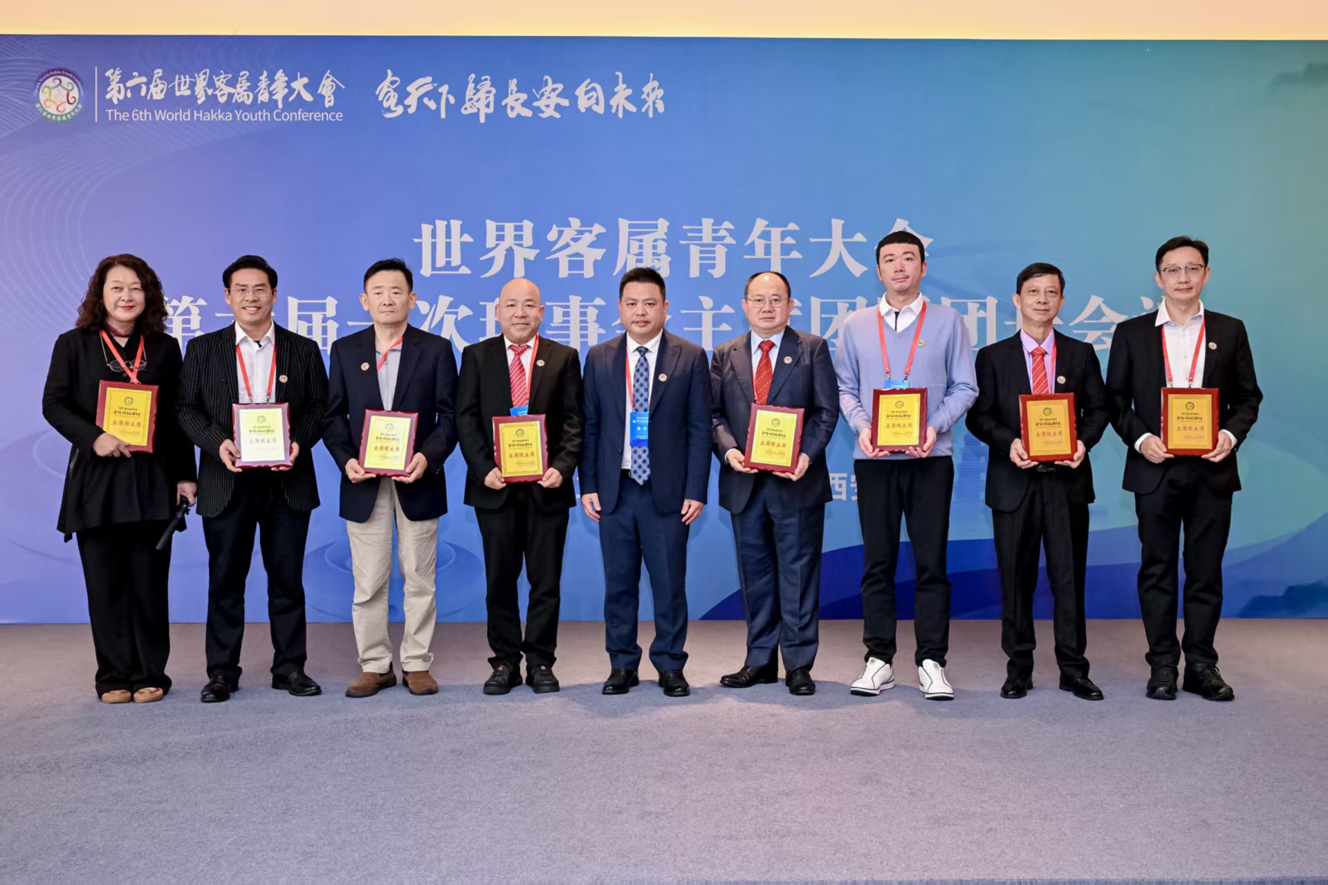 广东省客家青年企业家联合会轮值会长、圣地集团董事长林俊(右三)上台接受授牌第六届世界客属青年大会主席团主席