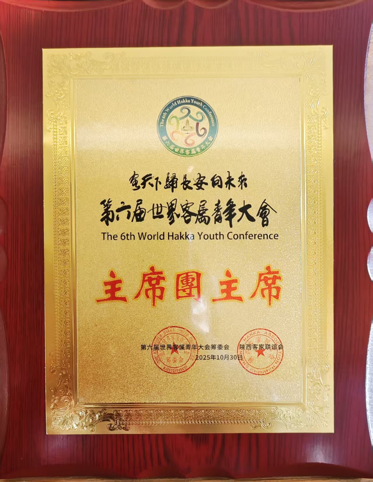 广东省客家青年企业家联合会轮值会长、圣地集团董事长林俊获第六届世界客属青年大会主席团主席牌匾